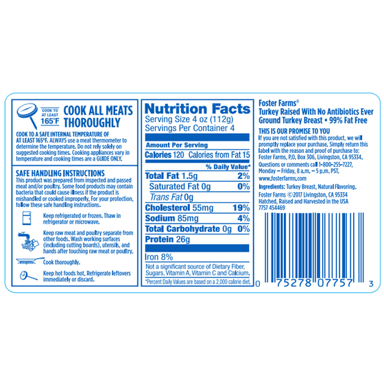2,000 calories a day is used for general nutrition . *the % daily value (dv) tells you how much a nutrient in a serving of food contributes to a daily diet. Nutritional facts · total fat 1.5g · saturated fat 0g · trans fat 0g · cholesterol 55mg · sodium 85mg · total carbs 0 · dietary fiber 0 · sugars 0g. Find where to buy 99% fat free ground turkey breast near you. 2,000 calories a day is used for general nutrition .