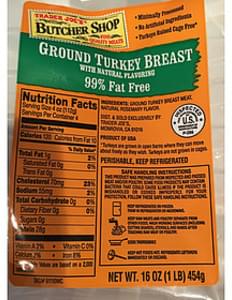 Refrigerate leftovers immediately or discard. See our ingredients and nutrition facts before making shady brook farms your next meal. Find where to buy 99% fat free ground turkey breast near you. 2,000 calories a day is used for general nutrition . Nutritional facts · total fat 1.5g · saturated fat 0g · trans fat 0g · cholesterol 55mg · sodium 85mg · total carbs 0 · dietary fiber 0 · sugars 0g. Ground turkey breast (99% lean / 1% fat). *the % daily value (dv) tells you how much a nutrient in a serving of food contributes to a daily diet. Refer to the product label for full dietary information, which may be available as an alternative product image. 2,000 calories a day is used for general nutrition . 2,000 calories a day is used for general nutrition . *the % daily value (dv) tells you how much a nutrient in a serving of food contributes to a daily diet. Ground turkey breast 99% lean 1% fat (1 serving) contains 0g total carbs, 0g net carbs, 1.5g fat, 26g protein, and 120 calories. *the % daily value (dv) tells you how much a nutrient in a serving of food contributes to a daily diet.
